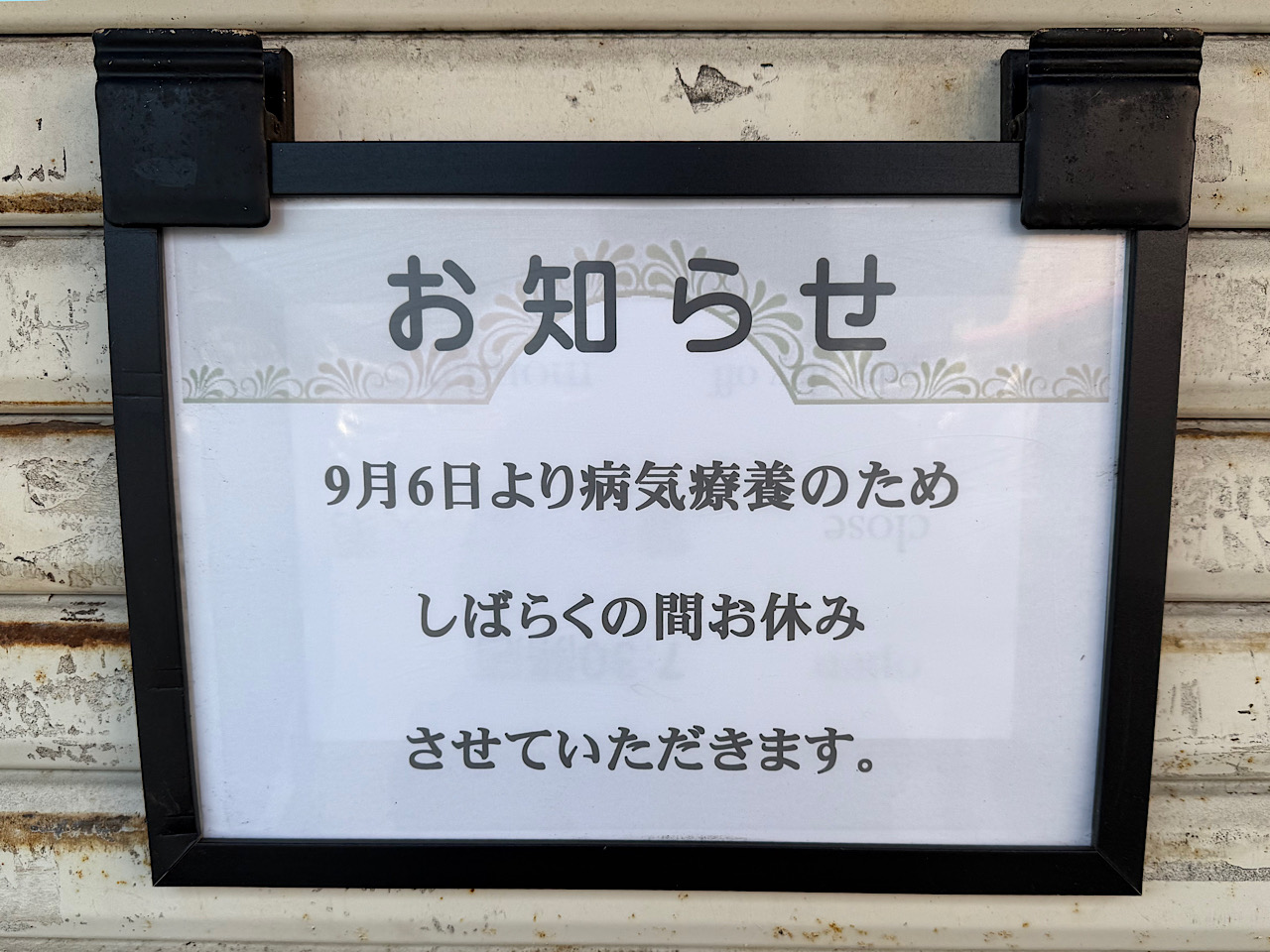 「すじ肉うどん たけや」のシャッターで張り紙を発見。