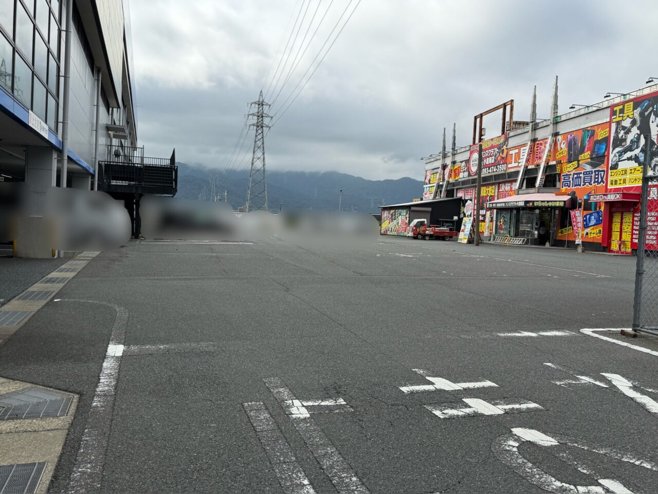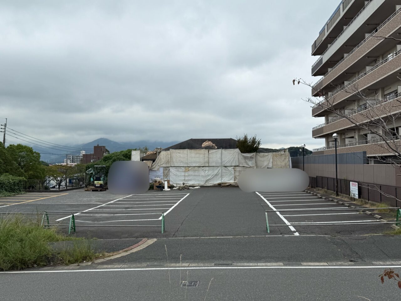 駐車場にはガードパイプが設置され、店舗だった建物には白いカバーと足場が組んでありました。周辺に張り紙や看板などはなく、現地で情報を得ることはできませんでした。