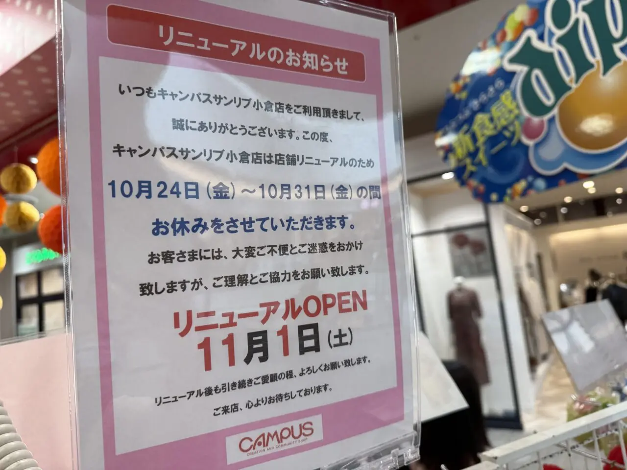 サンリブシティ小倉を散策中、2Fの「CAMPUSサンリブシティ小倉店」でリニューアルオープンのお知らせを発見しました。