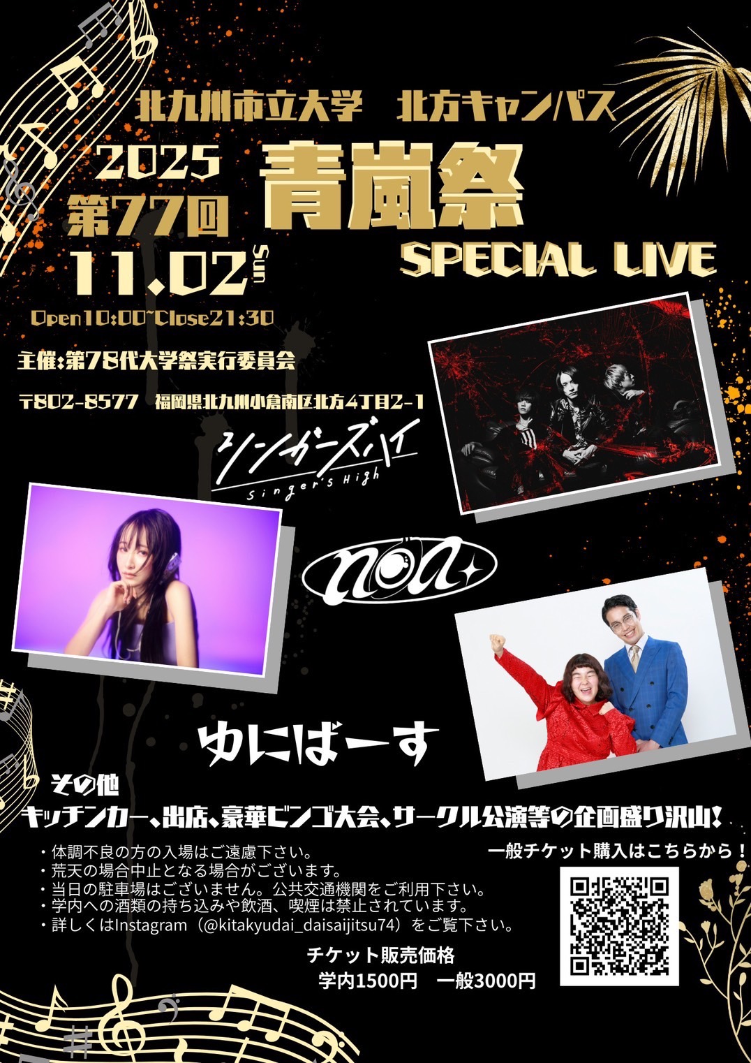 第77回青嵐祭は、「黎明」というテーマのもと、新たな挑戦と伝統の融合を体現した大学祭です。豪華ゲストライブ、学生の熱気あふれるステージ、個性豊かな展示、グルメ模擬店と、一日を通して「北九大の今」を全身で感じられる内容になっています。