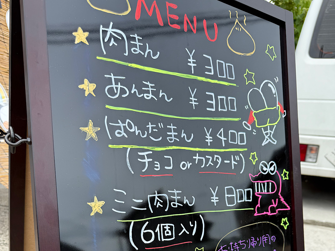 元祖おいちゃんの肉まん 炎和のメニュー表。いつも可愛いイラストが書いてあります♡