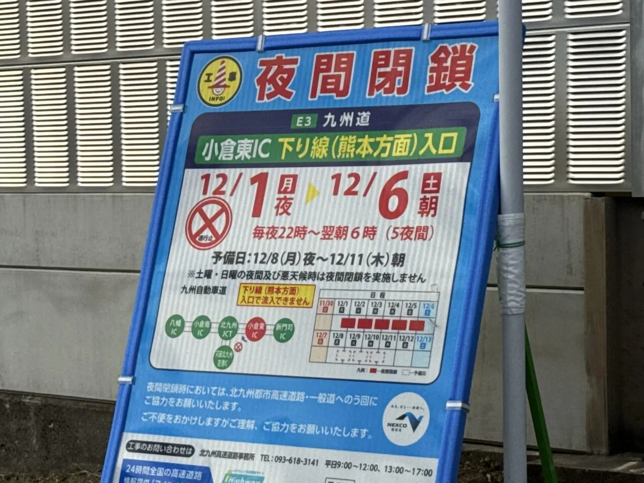 2025年12月1日から5日間、小倉東ICで工事による夜間閉鎖が行われます。