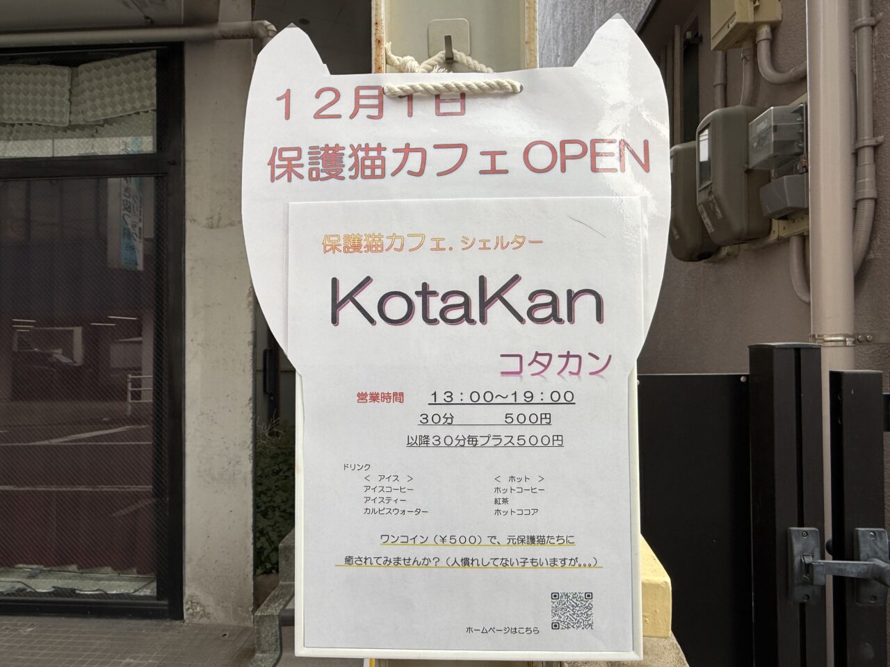 「12月1日 保護猫カフェOPEN」「保護猫カフェシェルター保護猫犬カフェ KotaKan(コタカン)」と書いてあります。