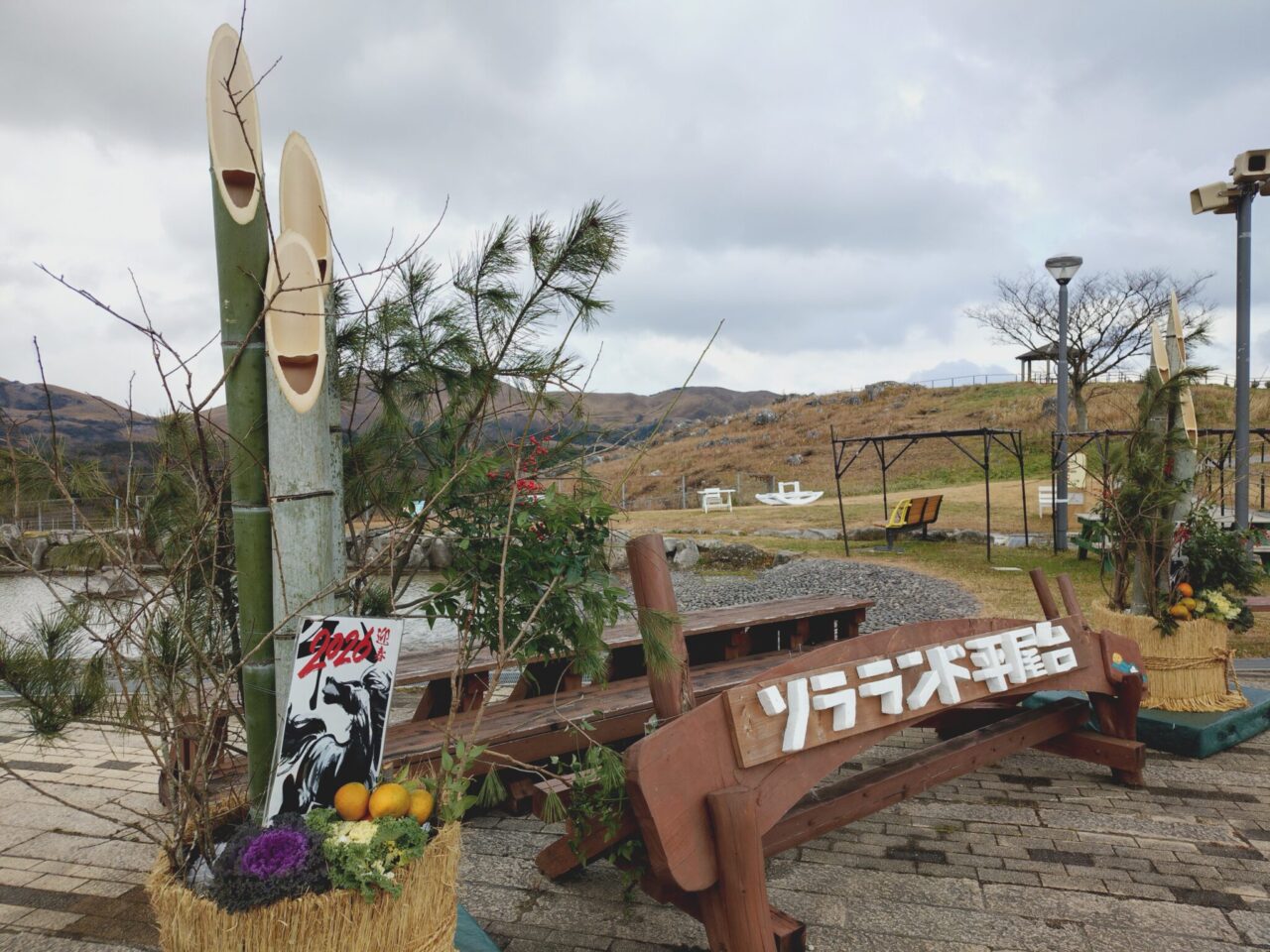 現在、ソラランド平尾台にはヴィレッジゾーンせせらぎ横にスタッフの皆さんの手作りの大門松が設置されています。
