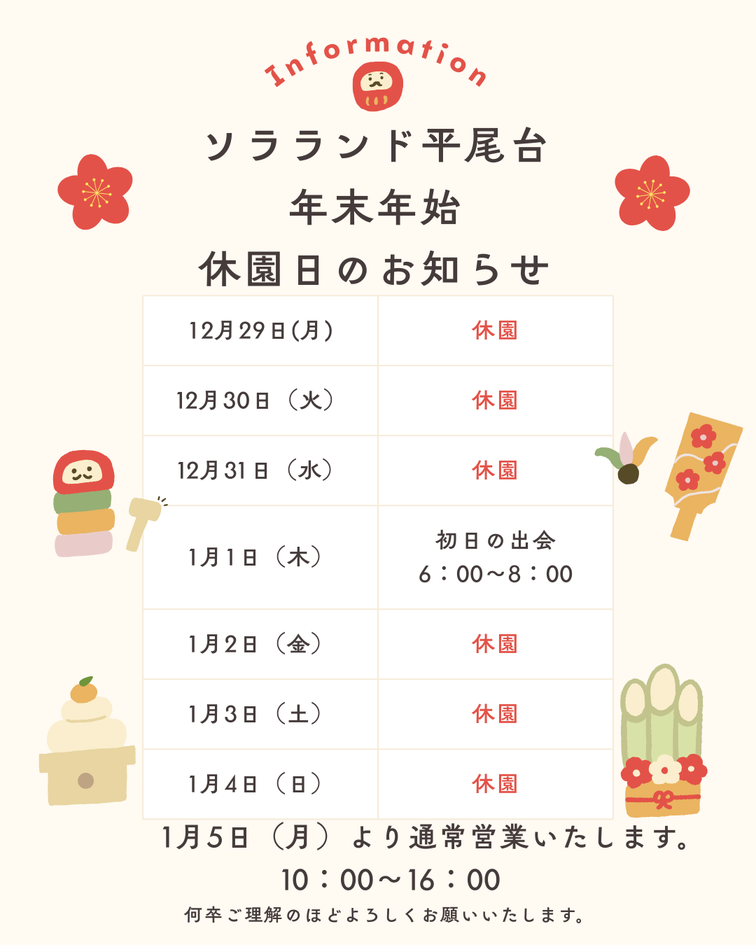 年末年始は休園期間があります。ご利用をお考えの方はご注意ください。
