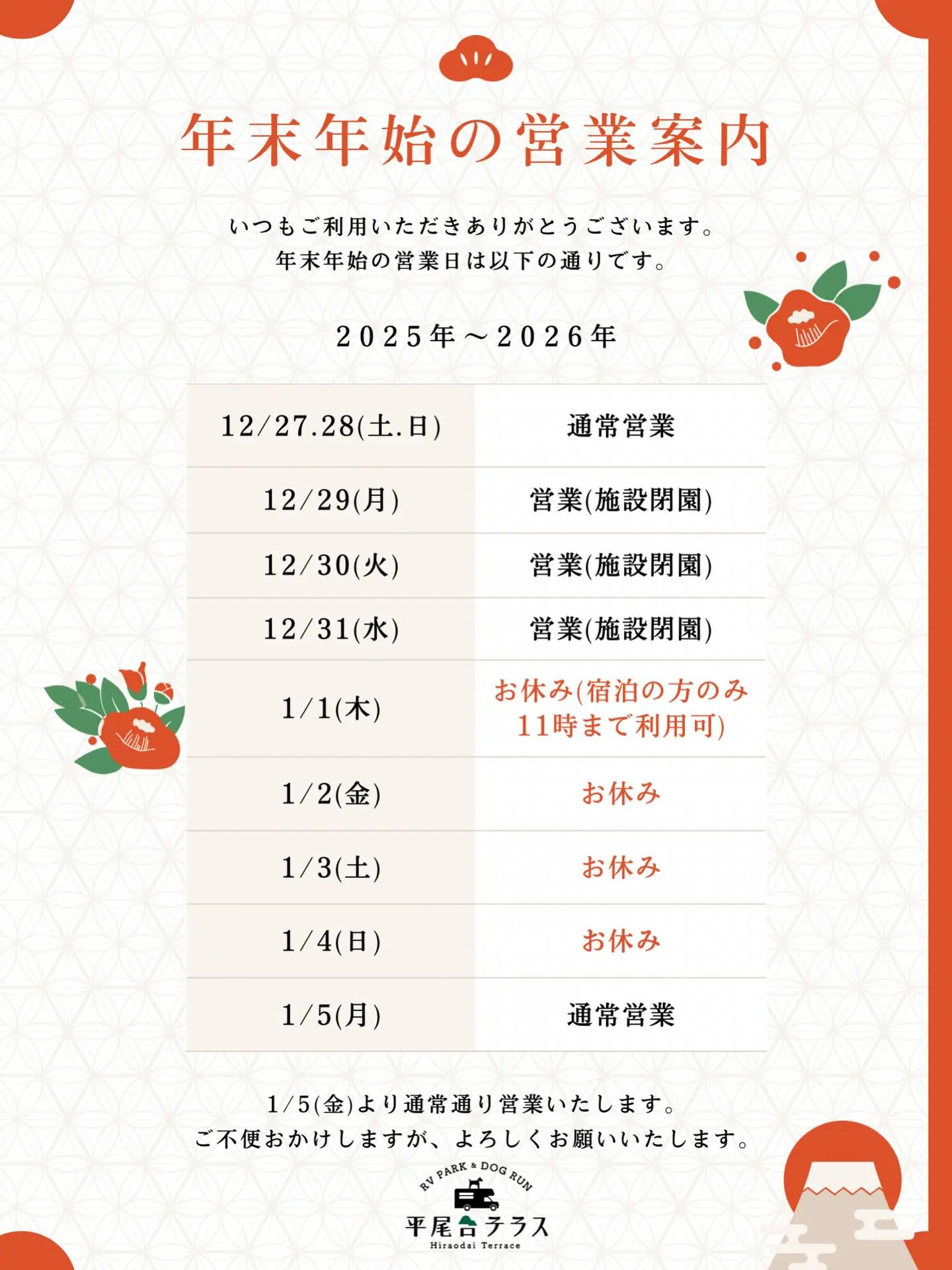 また、2025年12月29日(月)から31日(水)はドッグラン及びRVパークを除く公園施設内のご利用はできませんのでご了承ください。