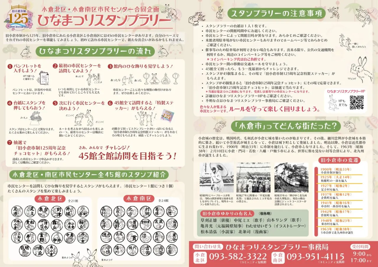ひなまつりスタンプラリーについての詳細は小倉南区役所コミュニティ支援課・小倉北区コミュニティ支援課にお問い合わせください。