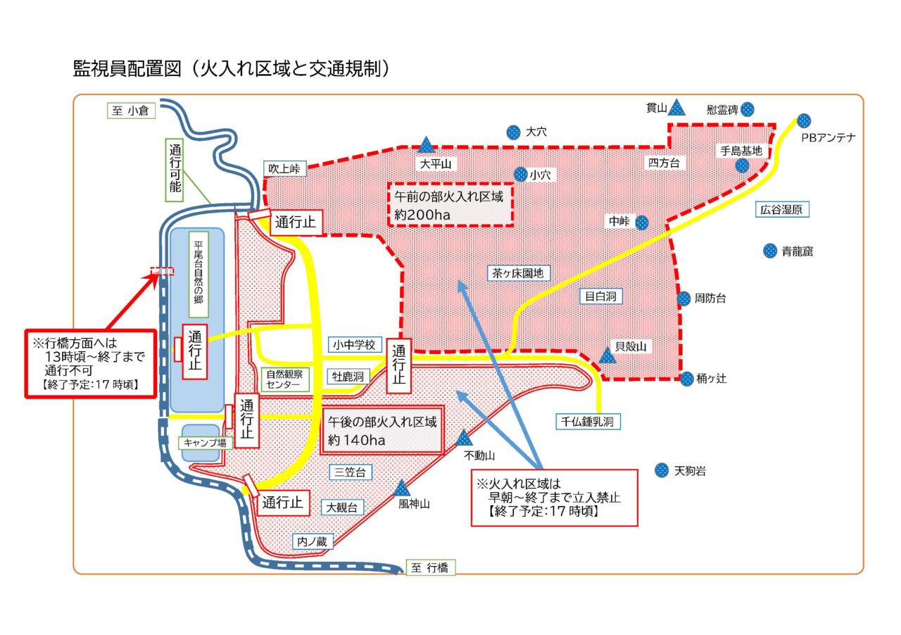 当日は安全のため入山規制が行われ、平尾台自然の郷以外の区域は立入禁止となります。マイカー・自転車・徒歩で自由に移動することができませんので、交通規制に従ってお出かけ下さい。