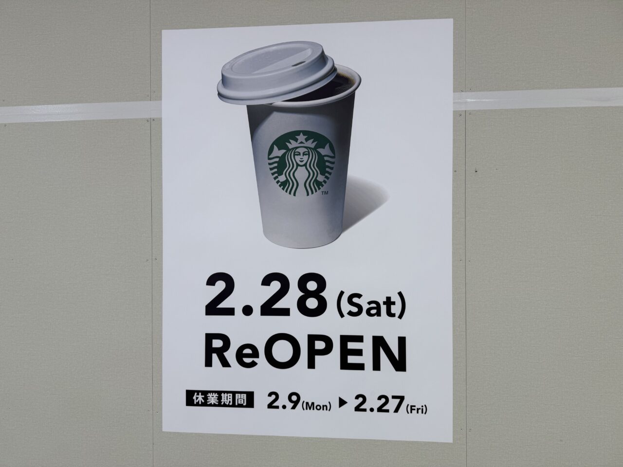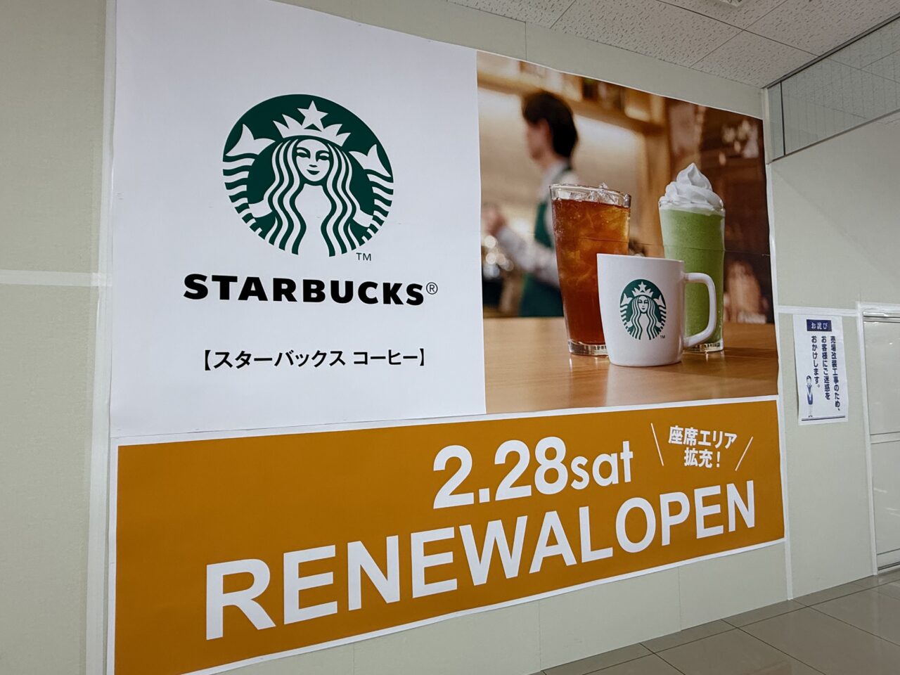 「スターバックス コーヒー」「2.28sat RENEWALOPEN」と書いてあります。更に「座席エリア補充!」という嬉しい情報もありました♡