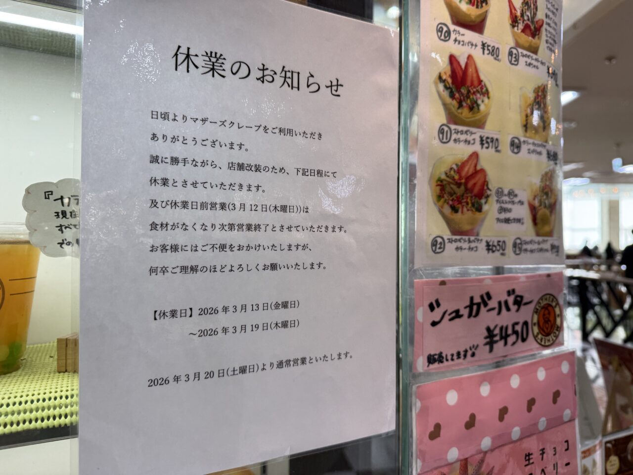 マザーズクレープの張り紙には休業のお知らせが書いてありました。