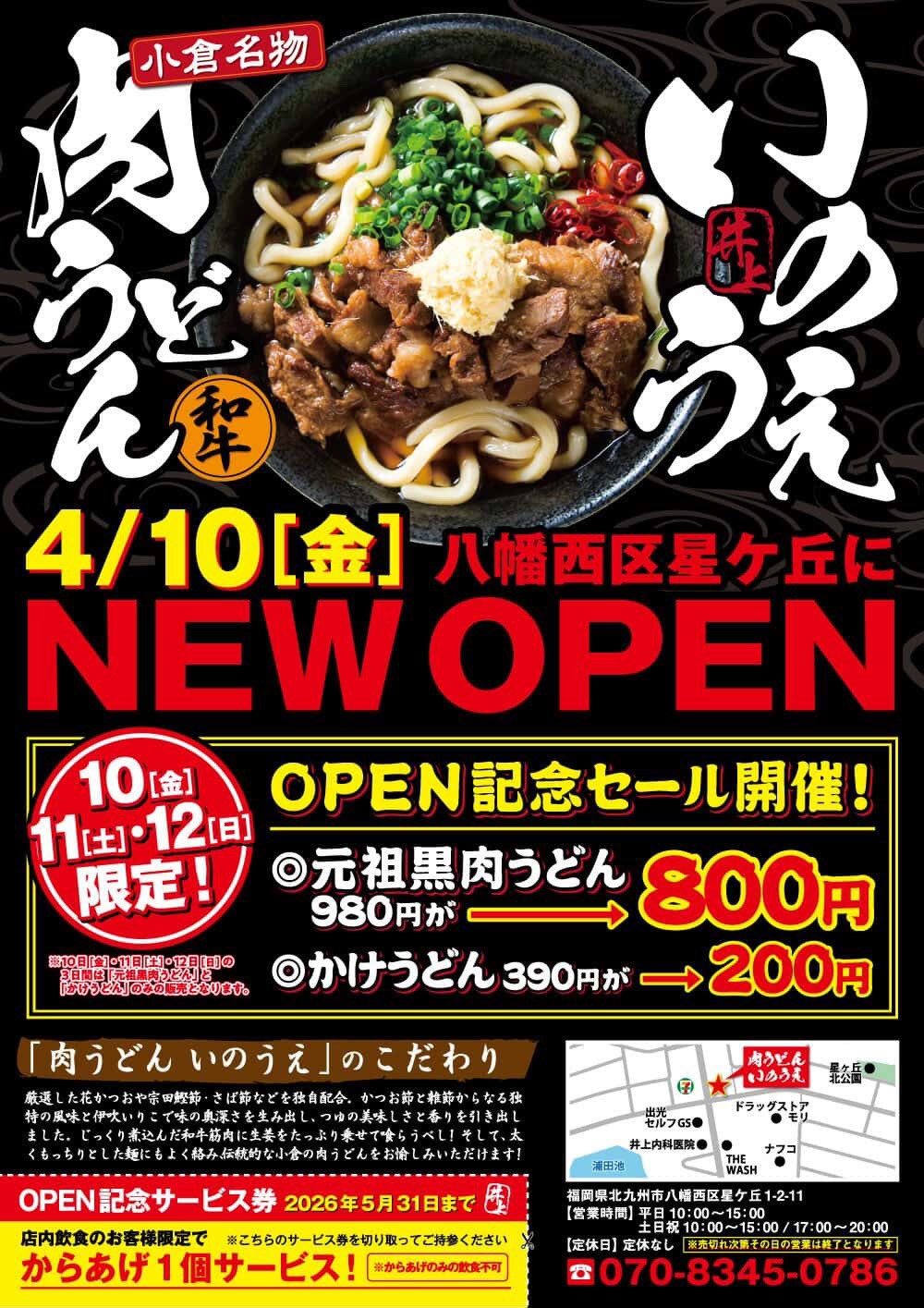 【北九州市】小倉名物「肉うどん いのうえ」に新店舗♪2026年4月10日、八幡西区星ヶ丘にOPENします!3日間限定セールも開催。
