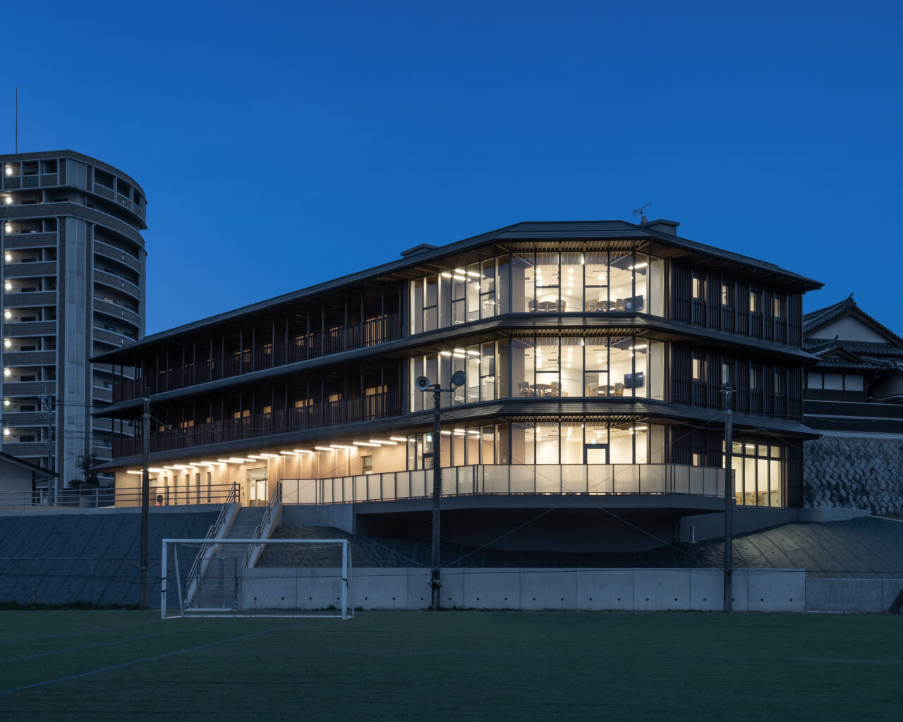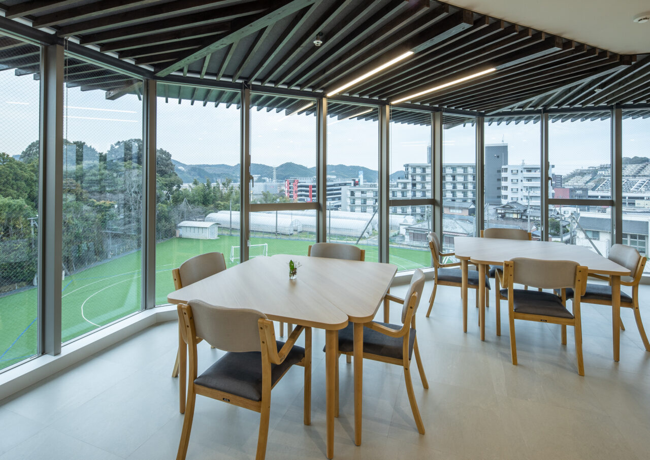 施設は自然に囲まれた丘の上に位置し、隣接する敷地内には、徳力神宮をはじめ、幼稚園、保育園、学童などの施設があり、子どもから高齢者まで多様な世代が身近に行き交う環境が広がっています。
