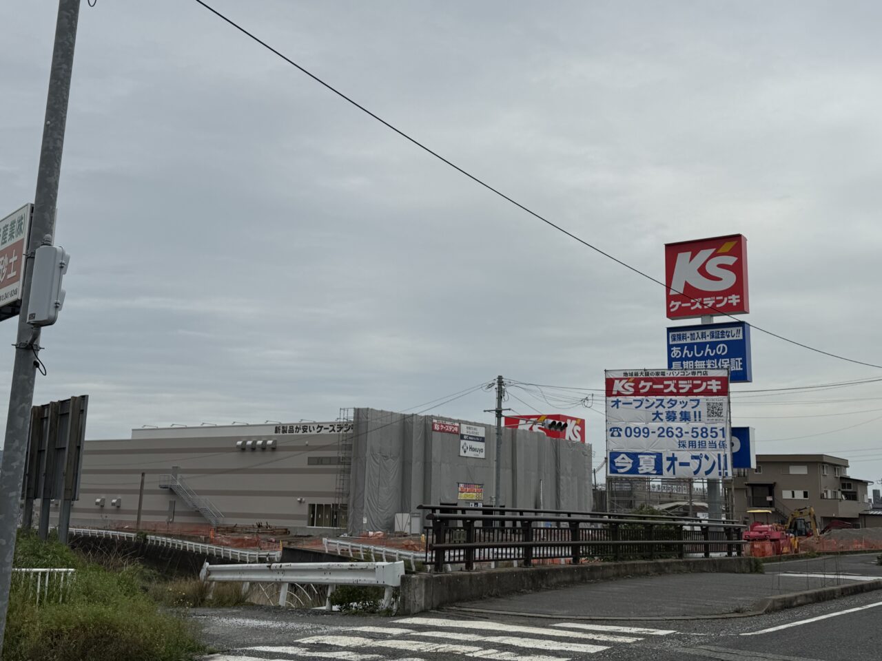 看板には「ケーズデンキ」の文字とロゴが。看板の下にはオープニングスタッフ募集の文字と「今夏オープン!!」と書いてありました。